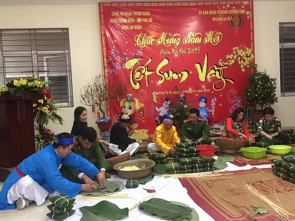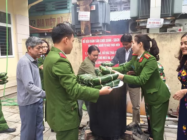 Các CBCS CAQ Thanh Xuân cùng người dân tổ chức gói bánh chưng