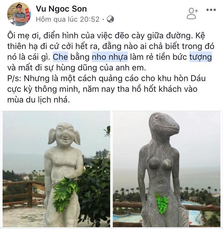Cùng với đó, nhiều tại khoản Facebook lại cho rằng đây là “chiêu” PR của Khu du lịch quốc tế Hòn Dấu khi mùa du lịch đang đến gần. Liên tiếp các tài khoản xã hội chia sẻ, bình luận nhiều ý kiến trái chiều về hình ảnh “y phục” mới của những bức tượng từ đêm 28-3 đến sáng 29-3-2018.