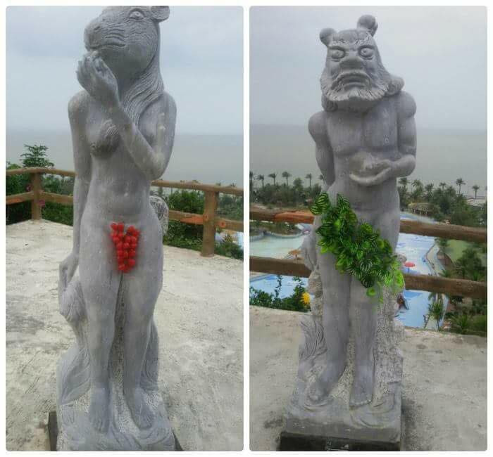 Được biết, trước khi đeo chùm lá, nho đỏ nho xanh cho các bức tượng, theo ông Hoàng Văn Thiềng - Chủ tịch HĐQT Công ty CP quốc tế Hòn Dấu thì nhiều người đang nhìn nhận bằng cảm xúc cá nhân chứ chưa nghiêm túc nhìn dưới góc độ giải trí: khi các con giáp được để khoả thân theo đúng nguyên bản, dư luận chê thô tục, khi tượng được mặc quần theo chỉ đạo của cơ quan quản lý thì kêu là phản cảm.