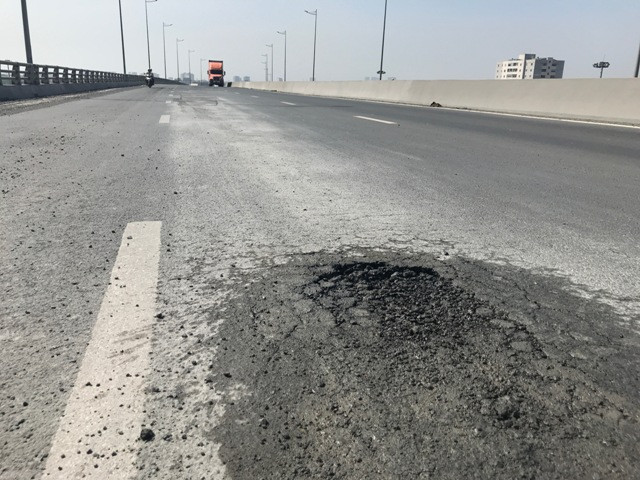 Ông Nguyễn Lập Sơn, Giám đốc tư vấn dự án thuộc Công ty CP Him Lam cho biết, do vừa qua xảy ra mưa lớn, trong khi thoát nước trên mặt cầu không tốt, cộng với xe tải trọng lớn lưu thông đã ảnh hưởng đến kết cấu của lớp nhựa thảm mặt đường, từ đó gây bong tróc, lún nứt.