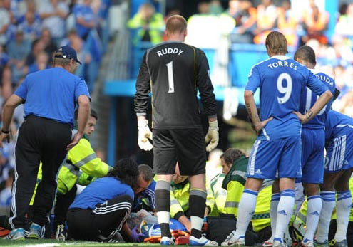 Phút 64, sân Stamford Brdige được một phen câm lặng khi Drogba bất tỉnh sau một pha tranh bóng với thủ thành Ruddy. Trong pha bóng này, Drogba đã lãnh trọn cú đấm của Ruddy và rơi xuống theo phương song song với mặt đất khiến tiền đạo người Bờ Biển Ngà phải được sơ cứu tới 15 phút trước khi rời sân bằng cáng. Cùng lúc này, HLV Villas-Boas thực hiện liền hai sự thay đổi người khi tung tân binh Mata và Anelka vào sân thay cho Malouda và Drogba.