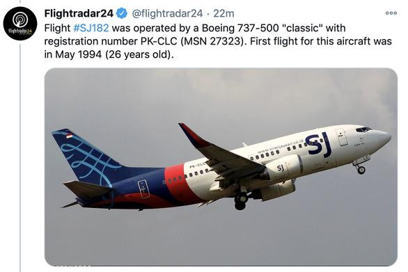 Theo trang web theo dõi chuyến bay FlightRadar24, máy bay chở khách của Sriwijaya Air đã mất liên lạc ở độ cao hơn 3.000m trong vòng chưa đầy 1 phút, khoảng 4 phút sau khi khởi hành từ Jakarta.