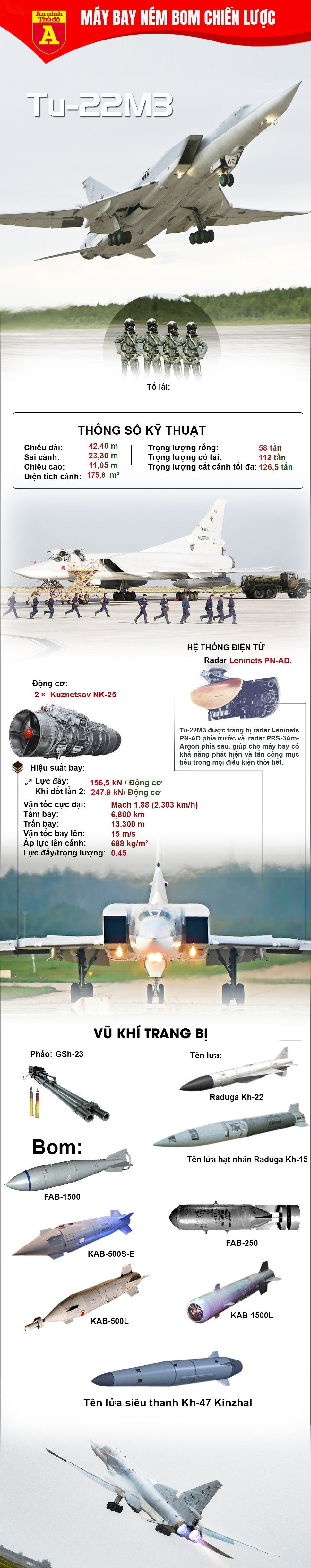 Máy bay ném bom Tu-22M3 đi vào hoạt động từ năm 1983, trong khi phiên bản hiện đại hóa Tu-22M3M mới nhất ra mắt năm 2018. Mẫu oanh tạc cơ này có chức năng chính là tiêu diệt các biên đội tàu sân bay đối phương, khiến nó có biệt danh "sát thủ diệt tàu sân bay".