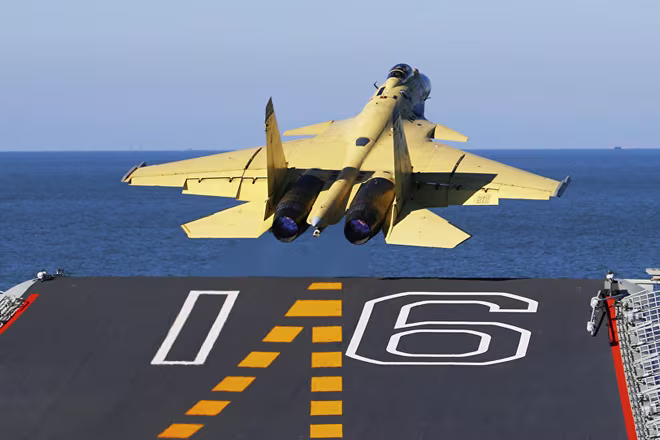 Máy bay tiêm kích J-15 cất cánh từ tàu sân bay Liêu Ninh của Trung Quốc. Ảnh minh họa