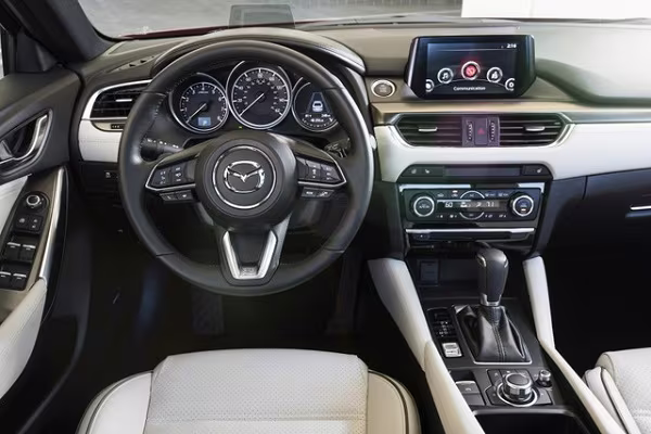 Trong nội thất, sự mới mẻ trở nên rõ ràng hơn với vô lăng 3 chấu giống CX-9, cùng với đó là màn hình hiển thị thông tin trên kính chắn gió Active Driving Display có chất lượng tốt hơn. Màn hình đa thông tin trên cụm đồng hồ của Mazda6 2017 được nâng cấp rõ nét và hiển thị thêm nhiệt độ nước làm mát và la bàn. Một số điểm đáng chú ý khác có thể kể đến như vô lăng sưởi ấm hay chỉ khâu mới trên tay vịn trung tâm ở hàng ghế sau.