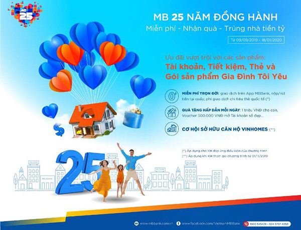 Chương trình “MB 25 năm đồng hành” với thông điệp “Miễn phí – Nhận quà – Trúng nhà tiền tỷ” được áp dụng từ nay đến 18/01/2020 dành cho khách hàng mới và tất cả các khách hàng đã gắn kết với MB.
