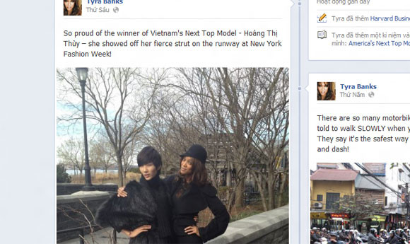 Vào hôm thứ 6 vừa qua, trên trang Facebook cá nhân của mình, siêu mẫu Tyra Banks, giám khảo America's Next Top Model đã chia sẻ, cô tự hào khi thấy quán quân Việt Nam 2011 Hoàng Thùy sải bước trên sàn diễn New York Fashion Week.