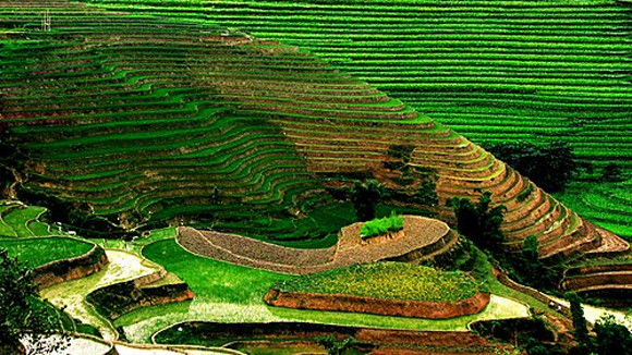 Nằm trên quốc lộ 2, từ thị trấn Tân Quang đến thị trấn Vinh Quang, huyện lỵ Hoàng Su Phì khoảng 60 km. Đường tuy quanh co nhưng dễ đi. Chừng nửa quãng đường đi từ quốc lộ 2 đến huyện lỵ là bạn bắt đầu lạc vào mê cung của ruộng bậc thang, những nấc ruộng tuyệt tác, trắng nước mênh mông trên thang núi. Trong mùa đổ ải, đó là ngày của những “kỹ sư” thủy lợi thể hiện sự tài tình dẫn nước từ trên cao về núi, đưa nước từ ruộng thấp lên cao. Nhiệm vụ này của người nông dân được người khám phá mệnh danh cho là kỹ nghệ đưa nước lên đồng. Chứng kiến sự kỳ tài của máng nước, cách dẫn nước lên đồng, ta mải bước chân theo họ len từng nấc ruộng, vừa đi vừa nghe tiếng thác đổ như bản nhạc nước giữa núi rừng, chợt ngoảnh lại, bước chân ta đã lên đỉnh cao của nấc thang tự bao giờ.
