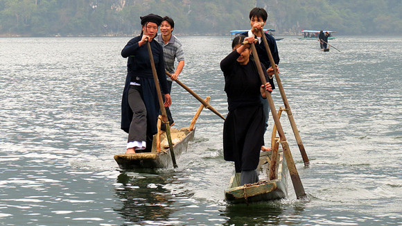 Thuyền chạy nhẹ qua những con nước hẹp xiên khe núi rồi lại mở ra cả một vùng xanh lục mênh mông. Phía hồ bên kia núi đang nhuộm đỏ ráng chiều thì ở phía bên này sương mờ bảng lảng, cảm giác không gian thay đổi nhanh đến giật mình. Thuyền nhẹ trôi bồng bềnh rồi như ẩn vào sương, mơ hồ, mờ ảo. Những cô gái áo chàm đi thuyền độc mộc hái măng rừng, đi lấy bầu khai (một loại rau đặc sản của người dân tộc Tày vùng hồ Ba Bể)… chợt hiện trong sương rồi lại ẩn vào với thiên nhiên huyền ảo. Chiều trên hồ Ba Bể nhẹ trôi như trong huyền thoại, “thoát tục”, chảy trong không gian bồng bềnh.