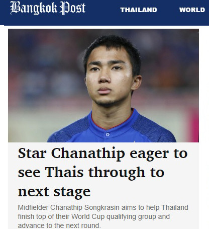 Trả lời tờ Bangkokpost vào hôm nay (13-8), tiền vệ Chanathip - người có biệt danh Messi Thái và hiện đang chơi cho CLB Sapporo giải J-League (Nhật Bản), tự tin nhận định ĐT Thái Lan sẽ vượt qua vòng loại thứ 2 bằng ngôi nhất bảng G.