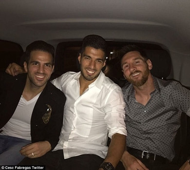 Fabregas, người đi cùng bạn gái Daniella Semaan, đã đăng tải một bức ảnh trên mạng xã hội Twitter cho thấy ngôi sao này đang ngồi cùng Messi và Suarez.