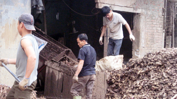 Quả đúng như lời cô gái, đang vào vụ tăng ca sản xuất phục vụ Tết Nguyên đán nên thời điểm này, không khí lao động ở Dương Liễu vô cùng tấp nập. Con đường chính từ chợ Sấu dẫn vào làng, đâu đâu cũng thấy những đống khoai dong (còn gọi là khoai đót, khoai hồng tinh), sắn chất cao vút, được nhập về trên những chuyến xe tải lớn mang biển số 22, 26 từ Sơn La, Tuyên Quang. Từ các bãi tập kết này, củ dong được các hộ gia đình vận chuyển về xưởng để làm miến. Theo tìm hiểu, khoai dong có giá trung bình 12.000 đồng/ kg, một tấn bột dong làm ra được khoảng 600kg miến.
