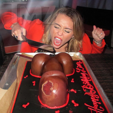 Trong bức hình gây sốc mới được đăng tải trên website TMZ, nữ ca sỹ kiêm diễn viên này tạo dáng khiêu gợi bên chiếc bánh sinh nhật hình cậu nhỏ tặng bạn trai cô, Liam Hemsworth, tại câu lạc bộ Icon, Los Angeles, Mỹ.