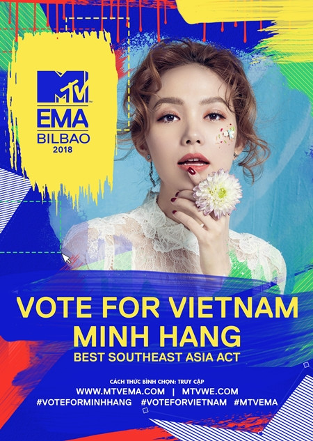 Để tiếp sức đại diện Việt Nam về đích tại hạng mục “Nghệ sĩ Đông Nam Á xuất sắc nhất” của Giải thưởng MTV EMA 2018, khán giả có thể tham gia bình chọn trực tiếp cho Minh Hằng tại 1 trong 2 địa chỉ: mtvwe.com hoặc mtvema.com/en-asia