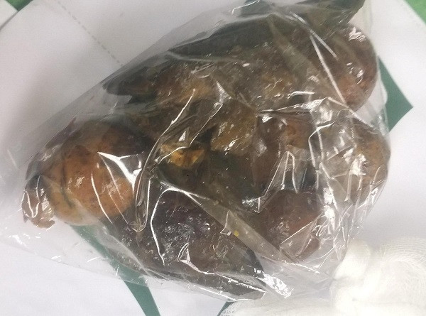 Khối bã thức ăn được lấy ra gồm hạt xoài, đồng xu, vỏ chanh leo... nguyên hình dạng