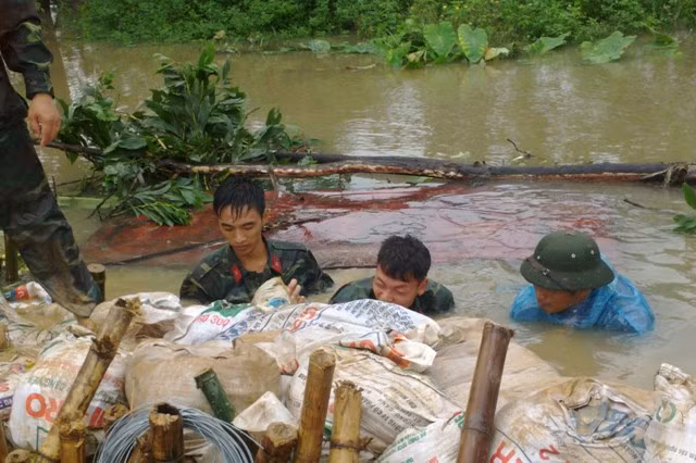 Lực lượng bộ đội gia cố kênh dẫn bị vỡ