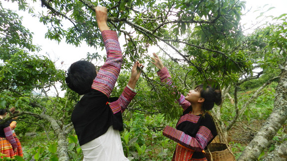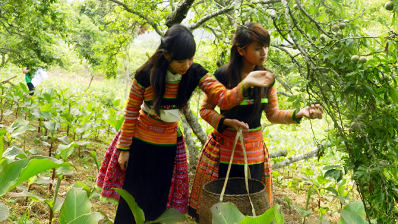 Thế là vườn mận, vườn đào chỉ còn lại mấy người chúng tôi loay hoay với các bộ váy của người Mông. Cả bọn cứ vừa mặc cho nhau vừa cười, sao thấy bà con mặc đẹp và dễ dàng thế mà mình thì mãi không mặc xong. Cuối cùng sau 15 phút cả nhóm cũng hóa thân được thành các sơn nữ Mộc Châu áo váy rực rỡ, vai đeo lù cở ra vườn quả thu hoạch.