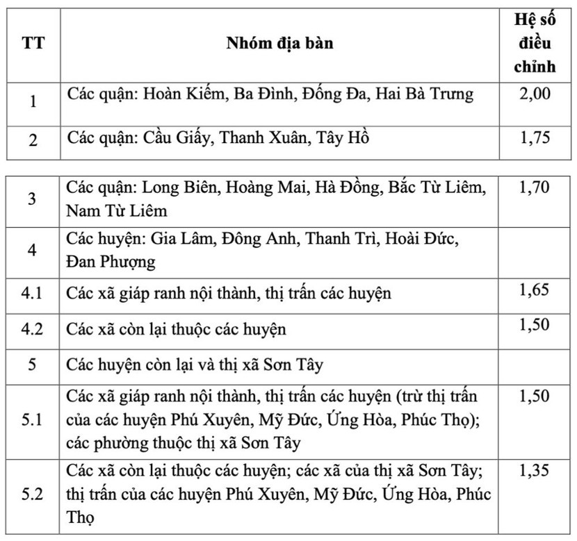 Cụ thể, hệ số điều chỉnh giá đất sản xuất kinh doanh phi nông nghiệp, đất thương mại dịch vụ như sau: