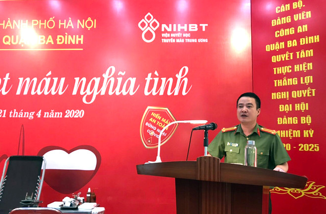 Phát biểu tại buổi lễ, Trung tá Phạm Hải Thắng – Trưởng CAQ Ba Đình, cho biết dịch Covid-19 bùng phát đã ảnh hưởng nghiêm trọng đến mọi mặt của xã hội, trong đó công tác vận động và tiếp nhận máu phục vụ cấp cứu, điều trị người bệnh gặp nhiều khó khăn.