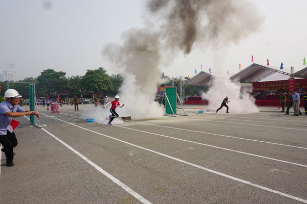 Một trong các nội dung thi của lực lượng chữa cháy cơ sở tại Hội thao