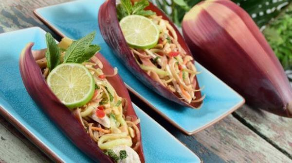 Hoa chuối là loại nguyên liệu để tạo nên các món nộm, điển hình như nộm hoa chuối tai lợn. Ngoài ra có thể dùng để làm các món như lươn nấu hoa chuối, chạch nấu hoa chuối... Hoa chuối thái mỏng còn có thể kết hợp làm rau sống cho các loại bún, đặc biệt là bún bò Huế hay món bánh đa cá rô đồng. Món lẩu riêu cua ngoài các loại rau sống như xà lách, mùi, láng, tía tô thì đương nhiên phải có thêm hoa chuối trong mâm. Nhiều nhà hàng nổi tiếng khi làm món lẩu cá lăng, hoặc cá lăng om giềng mẻ thì món đi kèm bao giờ cũng có thêm hoa chuối tây. Vị bùi, giòn của hoa chuối khiến món ăn thanh hơn.