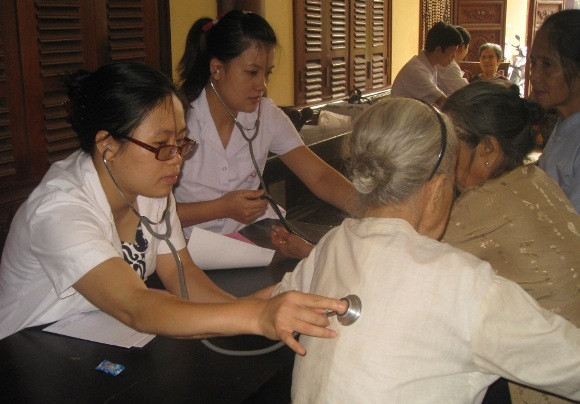 Khẩn trương thăm khám các cụ già, sau đó các bác sĩ chuyển sang kiểm tra tim, phổi