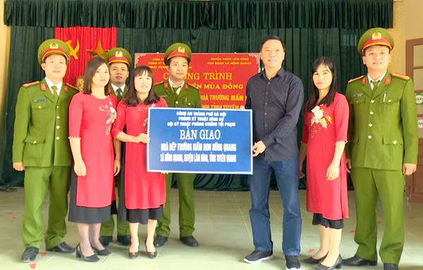Thượng tá Lê Minh Tiến, Phó trưởng Phòng Kỹ thuật hình sự và cán bộ chiến sỹ Đội Kỹ thuật phòng chống tội phạm bàn giao nhà bếp trường mầm non xã Hồng Quang, huyện Lâm Bình, tỉnh Tuyên Quang cho Ban giám hiệu nhà trường