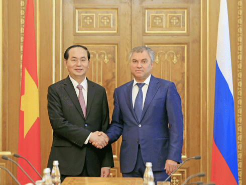Cũng trong sáng 30-6, Chủ tịch nước Trần Đại Quang đã có cuộc hội kiến với Chủ tịch Duma Quốc gia (Hạ viện) Nga Vyacheslav Volodin. Tại cuộc gặp, hai bên cũng nhấn mạnh nhiệm vụ ưu tiên hiện nay của Chính phủ, các bộ, ngành hai nước là triển khai hiệu quả Hiệp định Thương mại tự do Việt Nam -Liên minh Kinh tế Á-Âu.