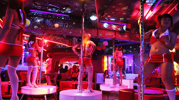 Ngay phía ngoài cửa, các cô gái mặc bikini hở hang tràn xuống đường mời chào, tiếp thị. Dừng lại trước một quán bar, người bạn dẫn chúng tôi vào bên trong. Dọc theo lối đi vào, những chàng trai đứng 2 bên nở nụ cười thân thiện và đưa khách vào chỗ ngồi. Âm nhạc nổi lên, ánh sáng quét qua sống động như một sân khấu ca nhạc thực thụ, các cô gái được thoát y hoàn toàn bước ra uốn éo cùng vũ công nam nhảy múa trên nền nhạc và không gian nóng dần với các màn trình diễn. Trong đó có cả những cô gái chuyển giới. Nếu khách muốn đi “tới bến” với cô gái nào chỉ cần chỉ vào cô đó và cả hai rời khỏi quán bar.