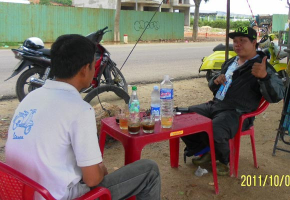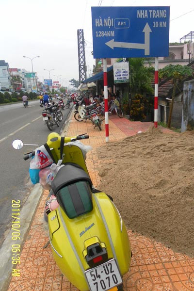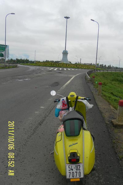 Nghỉ ngơi, gặp gỡ với một người chơi Vespa ở Quy Nhơn trong vòng 45 phút, A Chảy lại tiếp tục nai nịt lên đường, trực chỉ TP.Đà Nẵng. “Cứ được 100- 120km, tôi lại dừng lại đổ xăng. Bình xăng chứa được 7 lít, song cứ còn 3 lít thì phải đổ thêm, đề phòng không gặp cây xăng giữa đường”- A Chảy kể- “Vespa Super 150cc là loại xe 2 thì, cần cho thêm dầu nhớt vào xăng. Trước khi xuất phát, tôi để trong cốp phụ 8 bình dầu nhớt. Tổng cộng suốt hành trình đổ xăng hết khoảng 12-13 lần, song dầu nhớt thì mới chỉ dùng hết phân nửa”.