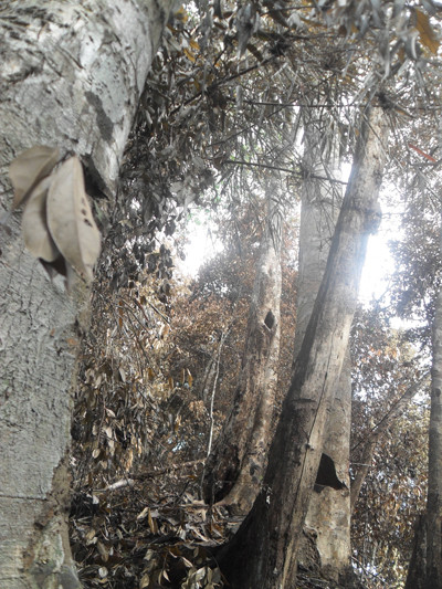 Có mặt tại điểm hẹn, chúng tôi theo chân 2 tổ viên Tổ Quản lý và Bảo vệ rừng của xã Thượng Cửu bắt đầu hành trình thâm nhập ngọn núi Suối Dẹn. Từ trung tâm xã đi xe máy theo con đường gồ ghề đầy đá sỏi khoảng 7km mới đến được chân núi Suối Dẹn. Tại đây, khách phải gửi xe để “nuốt” tiếp hành trình đi bộ leo núi kéo dài khoảng vài giờ đồng hồ. Con đường mòn bé xíu chỉ đủ một người đi càng thêm khó khăn sau mấy đêm mưa rào. Lúc đầu đường còn thoáng đãng, nên chúng tôi di chuyển còn dễ dàng, nhưng chỉ 20 phút sau là phải đối diện với những pha luồn người, cúi lưng mà đi. Vì là rừng nguyên sinh nên cây cối rậm rạp, thi thoảng 2 tổ viên lại phải dùng dao phát những cây che khuất lối đi để đánh dấu đường. Càng lên đến gần đỉnh núi, đường đi càng khó khăn hơn với hình chóp nhọn và mùi khen khét của khói càng sộc mạnh hơn vào mũi. Leo lên vài ba con dốc như vậy, cuối cùng chúng tôi cũng đặt chân lên được đỉnh ngọn “núi… phun… lửa”. Một cảnh hoang tàn hiện ra trước mắt, cây cối chết khô héo nhưng không hề có một ngọn lửa nào bốc lên. Khu vực trung tâm có khói bốc lên từ đá có nhiệt độ ấm hơn, những rễ cây bám vào đá và lớp thực vật rêu, sỉ đã đen thành than. Theo thống kê sơ bộ của Tổ Bảo vệ rừng, tại khu vực có khói có khoảng 15 cây táu đường kính 30cm trở lên và 40 cây táu đường kính dưới 30cm bị khói lửa táp vào đang chết dần. Đúng là một điều lạ lẫm vì các cây đều bị chết do một lượng nhiệt lớn làm cháy từ rễ cây. Lớp thực vật bám vào đá hoặc gốc cây nối liền nhau đều đã đen thành than. Chiếc hang Gió bị khuất sau những tảng đá to, không có đường ra cũng không còn cột khói trắng xóa hay hiện tượng lạ nào...