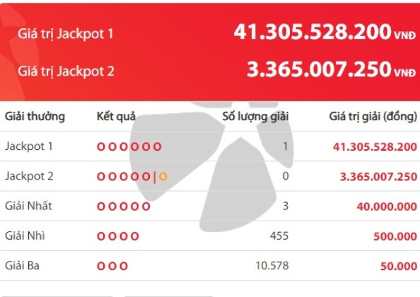 Công ty Xổ số điện toán Việt Nam (Vietlott) thông báo kỳ quay số mở thưởng 201 loại hình Power 6/55 đã có 1 vé trúng giải Jackpot 1 trị giá 41,3 tỉ đồng.