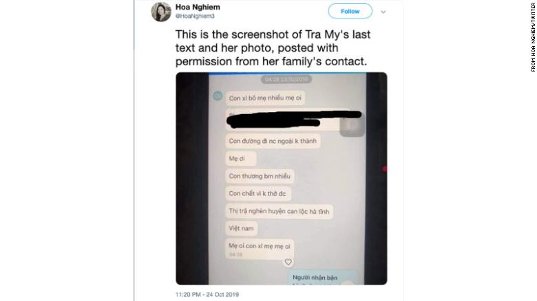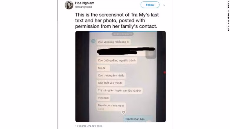 Tin nhắn văn bản của Trà My đã được gửi vào lúc 4h28 sáng 23-10, giờ Việt Nam, tức là 22h28 ngày 22-10, giờ Anh. Trong đoạn tin ngắn ngủi, cô gái xin lỗi bố mẹ vì con đường ra nước ngoài không thành công và có ghi rõ quê quán thị trấn Nghẽn, Can Lộc, Hà Tĩnh.