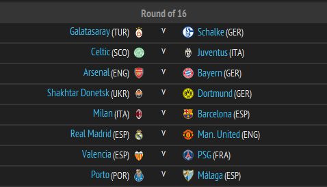 Một cặp đấu cũng rất được chờ đợi khác là Arsenal và Bayern Munich, hai cái tên lừng lẫy ở 2 quốc gia Anh và Đức sẽ so tài cao thấp. Các cặp đấu còn lại cũng hứa hẹn đầy hấp dẫn, đó là Shakhtar Donetsk - Borussia Dortmund, Porto - Malaga, Galatasaray - Schalke, Celtic - Juventus.