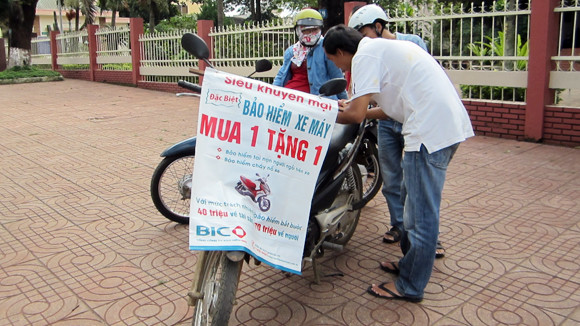 Bảo hiểm xe máy giá rẻ xuất hiện trên thị trường Hà Nội khá rầm rộ với đủ các chiêu quảng cáo, thu hút người mua như giảm giá sâu, mua một tặng một…. Theo ghi nhận, trong tháng 10 và tháng 11-2013, tại Hà Nội, trên các đoạn đường Nguyễn Xiển, Lê Văn Lương, Lê Đức Thọ, chân cầu Thăng Long vào cuối giờ chiều, hàng loạt điểm rao bán bảo hiểm giá rẻ di động với biển quảng cáo rất hút như “Giảm giá sốc”, “Mua 1 tặng 1”… Các điểm bán bảo hiểm này bán các loại bảo hiểm trách nhiệm dân sự bắt buộc đối với người sử dụng xe máy với giá rất rẻ. Giá bán của đại lý cũng khác nhau. Thậm chí, có hãng giá bán bảo hiểm bắt buộc/năm chỉ 35.000 đồng, trong khi mệnh giá ghi trên bảo hiểm là 66.000 đồng, số còn lại dao động từ 40.000- 50.000 đồng, nếu mua mệnh giá 2 năm, giá trị còn rẻ hơn với giá 70.000 - 75.000 đồng/giấy chứng nhận.