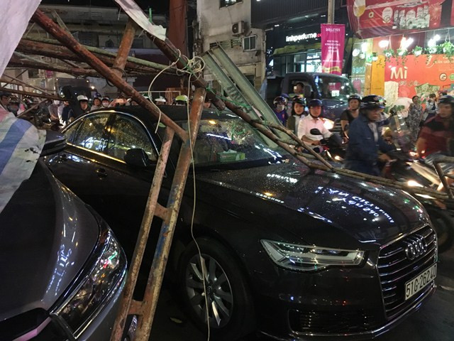 Trong mưa dông, một giàn giáo trên đường Cách Mạng Tháng Tám, quận 1 (đoạn gần ngã sáu Phù Đổng) bất ngờ sập xuống, đè 2 ô tô đang dừng đèn đỏ trên đường, trong đó có một chiếc Audi.