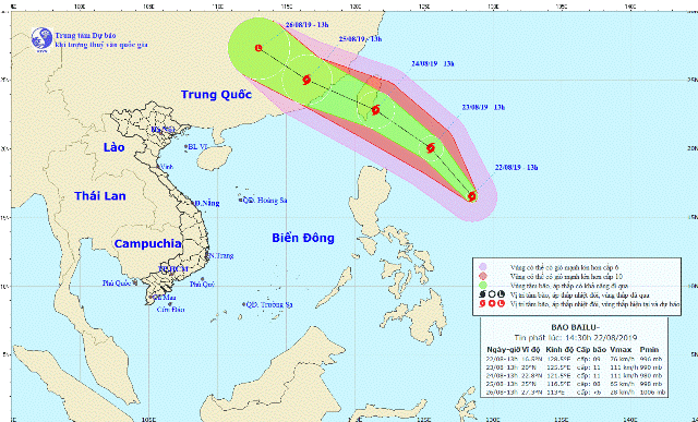 Vào 13h chiều mai, 23/8, vị trí tâm bão ở khoảng 20,0 độ Vĩ Bắc; 125,5 độ Kinh Đông, cách Đài Loan (Trung Quốc) khoảng 550km về phía Đông Nam. Sức gió mạnh nhất vùng gần tâm bão mạnh cấp 10-11 (90-115km/giờ), giật cấp 13.