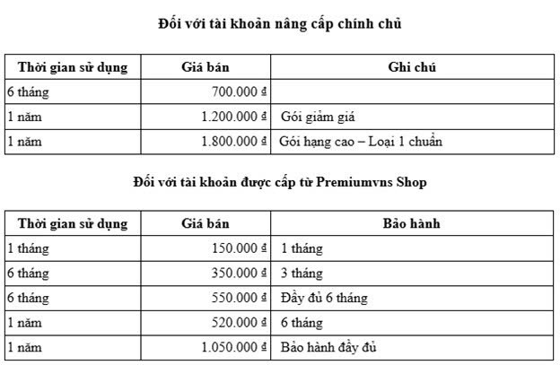 Dưới đây là bảng giá tham khảo mới nhất do Premiumvns Shop cung cấp: