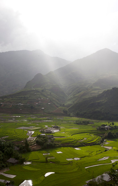 Những mảng màu phân biệt rõ rệt vào đầu mùa cày cấy, nhưng chỉ vài tuần sau đã thành chuyển một màu thống nhất xanh mướt màu lúa non
