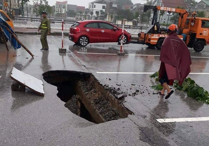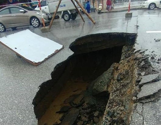 Mặt đường sụt lún nghiêm trọng tạo thành hố tử thần sau cơn mưa lớn kéo dài