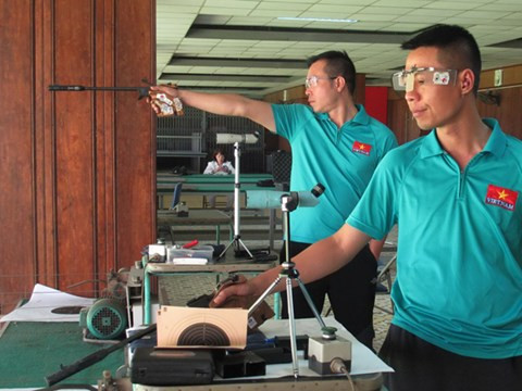 Hai xạ thủ kỳ cựu Hoàng Xuân Vinh (phía sau) và Trần Quốc Cường là niềm hy vọng của bắn súng Việt Nam tại SEA Games tới