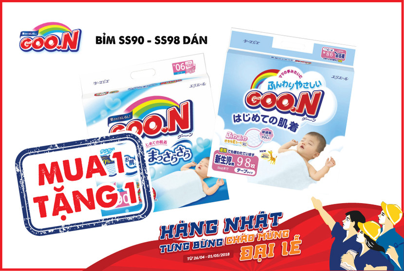 Điểm nhấn của chương trình "Hàng Nhật tưng bừng - Chào mừng Đại lễ" là bỉm Goon nội địa Nhật Bản dành cho bé dưới 5 kg được ưu đãi mua 1 tặng 1, dành cho bé từ 9-14 kg ưu đãi mua 2 tặng 1, và đồng loạt ưu đãi với mức 329.000 VNĐ với các size còn lại. Bỉm Goon được các mẹ bỉm sữa đánh giá rất cao bởi độ thấm hút vượt trội, bỉm siêu mỏng, mềm mại đem lại cảm giác thoải mái cho bé khi sử dụng.