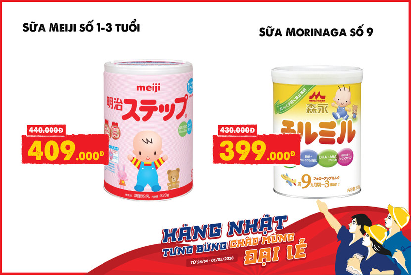 Bên cạnh bỉm, sữa cũng là một trong những sản phẩm thiết yếu được các mẹ vô cùng quan tâm, hàng tháng nó chiếm một khoản chi không hề nhỏ trong gia đình đang nuôi con nhỏ. Chính vì vậy, những cơ hội “ săn” hàng với mức giá hợp lý, tiết kiệm, nguồn gốc xuất xứ rõ ràng đảm bảo an toàn cho bé luôn được các mẹ bỉm sữa chờ đón. Trong chương trình này mẹ tiết kiệm tới 31.000 VNĐ khi mua 01 lon, 248.000 VNĐ khi mua 01 thùng sữa dành cho bé: 1-3 tuổi từ 2 thương hiệu sữa nổi tiếng Nhật Bản là Morinaga và Meiji.