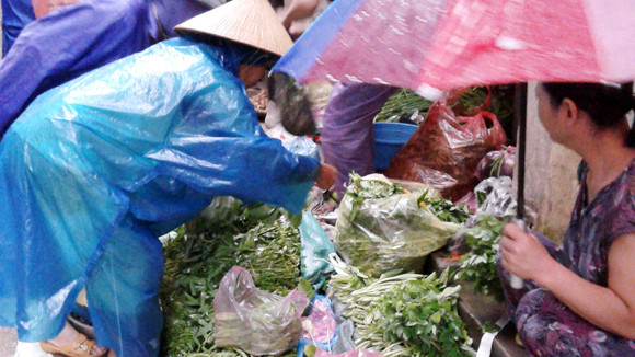 Tại một chợ cóc gần nhà, sau khi tham khảo giá rau tại 3 hàng khác nhau với số lượng rau còn lại khá ít ỏi, bà Nguyễn Thị Hòa – cán bộ hưu trí ở phố Kim Mã Thượng, quận Ba Đình – đành phải chọn 1 bó rau muống, 1 bó rau mồng tơi đã khá nát với giá 9.000 đồng/ bó. Theo bà Hòa, vào những ngày mưa bão, việc đi chợ mua được 1 mớ rau vừa ngon, vừa rẻ là điều không thể. Đành rằng khi trời mưa to, việc thu hoạch, vận chuyển rau gặp nhiều trở ngại nên người trồng, người bán rau tăng giá là bình thường. Song, việc tăng giá gấp 3, 4 lần là khó có thể chấp nhận. “Người tiêu dùng không còn cách nào khác đành phải nhắm mắt móc hầu bao mua một bó rau có giá cao gấp nhiều lần so với giá trị thực của nó. Điều đáng nói là hầu hết các mặt hàng khi đã tăng giá đều “quyết không xuống” nên giá cả cứ thế leo thang, chỉ khổ cho những người dân thu nhập thấp phải tìm đủ mọi cách thắt chặt chi tiêu. Thôi thì cố gắng bóp mồm bóp miệng, rau đắt thì ăn ít đi vậy” – bà Hòa phàn nàn.