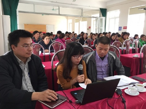 Ông Vũ Mạnh Hùng (hàng đầu, bên phải) giải đáp thắc mắc tại một buổi tập huấn về thu BHXH