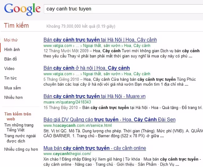 Chỉ cần vào Google gõ các từ khoá “cay canh truc tuyen”, “bán mai cảnh”, “bán quất cảnh”, “bán đào cảnh”… người dùng có thể nhận được hàng triệu kết quả trả về với rất nhiều thông tin chào bán trên mạng.