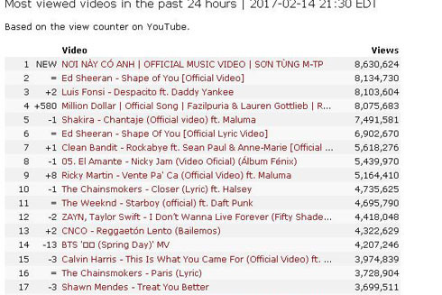 MV "Nơi này có anh" đã đứng đầu trong danh sách MV có lượng người xem cao nhất thế giới của Kworb.net
