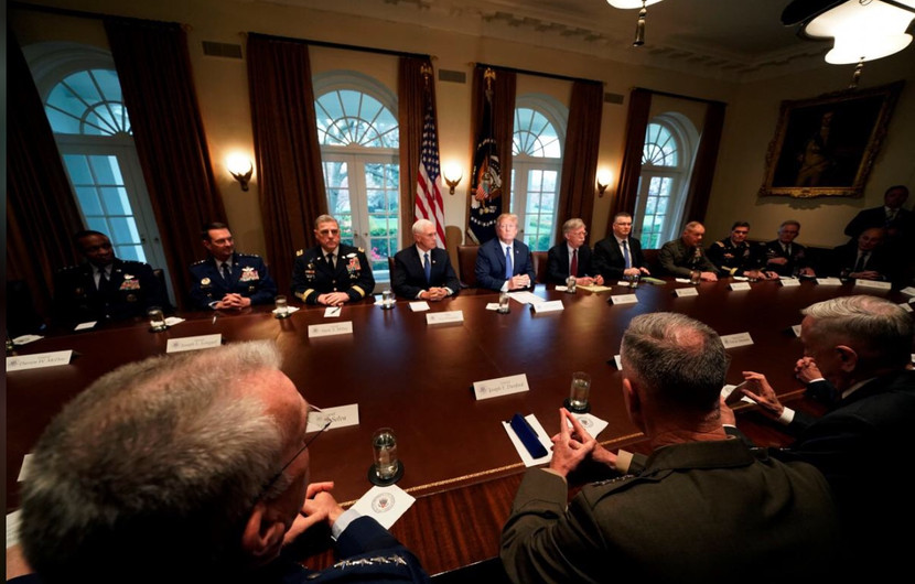 Tổng thống Mỹ Donald Trump nghe nhận định tình hình từ Phó Tổng thống Mike Pence và Cố vấn An ninh Quốc gia John Bolton trong phòng họp nội các Nhà Trắng tại Washington DC, ngày 9/4/2018