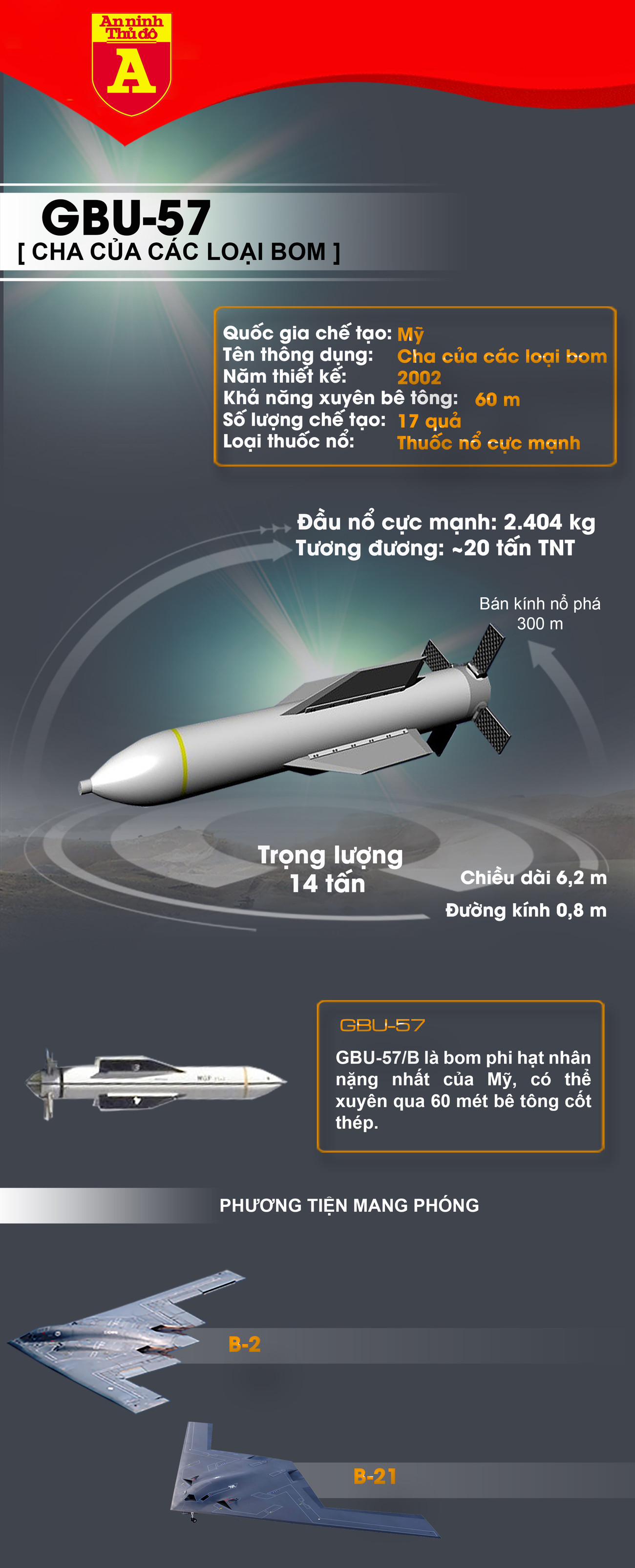 GBU-57 hiện được coi là loại bom phi hạt nhân mạnh nhất của Mỹ, chúng còn được biết đến với biệt danh "cha của các loại bom" hay "nắm đấm của quỷ" bởi sức công phá kinh hoàng. GBU-57 còn có tên đầy đủ là Massive Ordnance Penetrator với chiều dài khoảng 6,2 m, có sở trường tiêu diệt những mục tiêu nằm sâu trong lòng đất, boong-ke hoặc hầm trú ẩn.