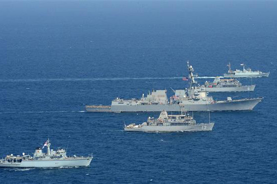 Đơn vị dò mìn của Lực lượng Phòng vệ Trên biển Nhật Bản, Hải quân Mỹ và Pháp cùng lên tàu tấn công đổ bộ của Anh nằm ngoài khơi Bahrain. Tại đây, các bên chia sẻ bí quyết sử dụng thiết bị để dò và gỡ mìn.
